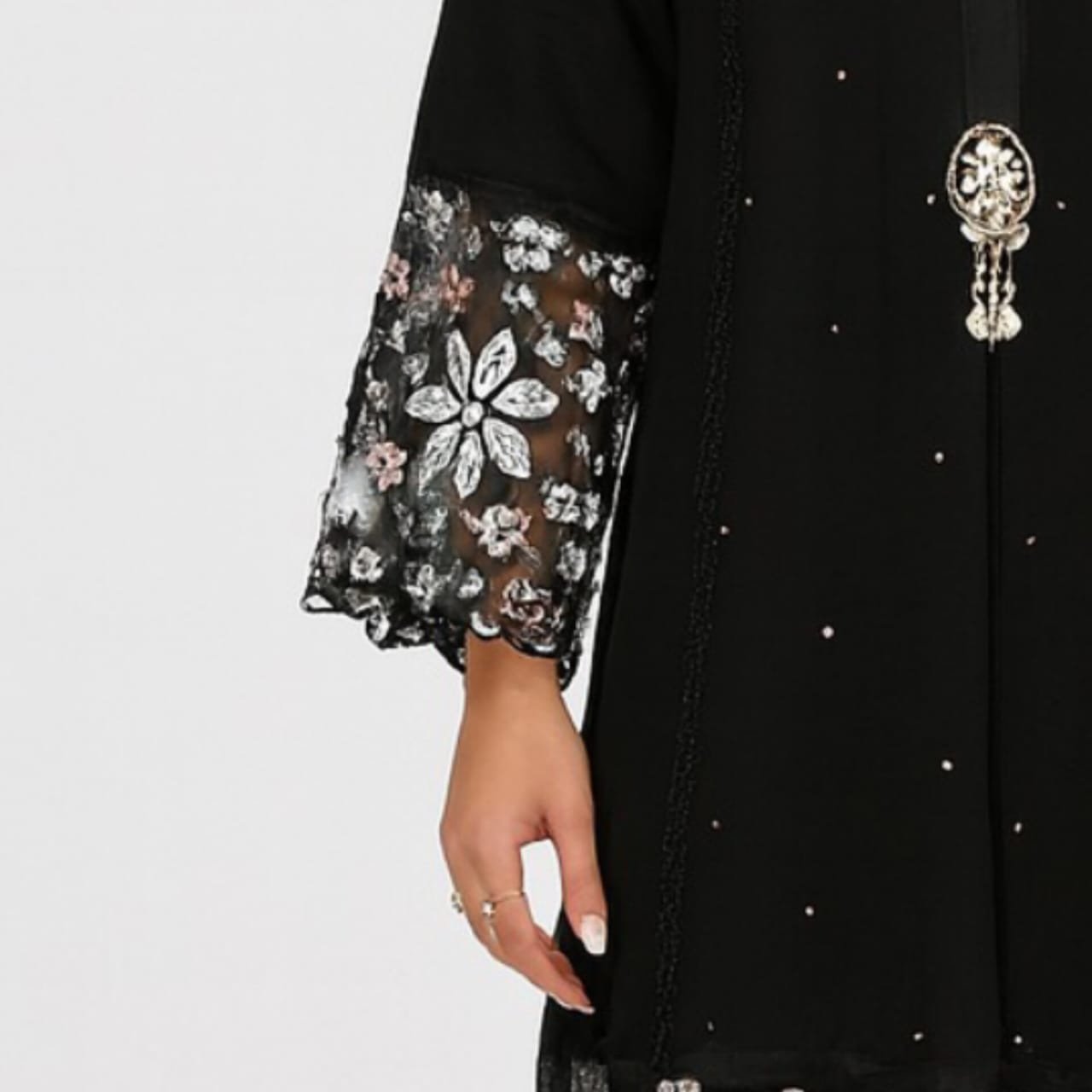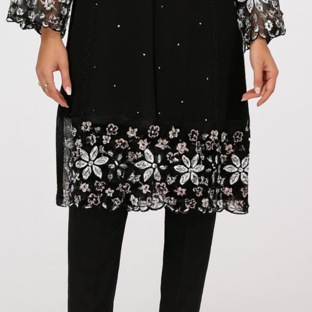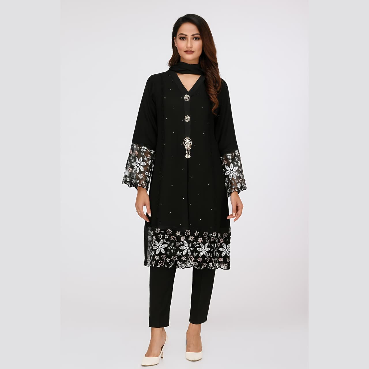 A luxurious 3-piece chiffon suit made with soft and light fabric, featuring handwork and elegant embroidery for a premium look. Perfect for weddings, parties, and formal gatherings, this suit is available in classic black, making it easy to style. It is comfortable, designed for special occasions, and comes with a matching dupatta and trouser set for a complete traditional outfit.