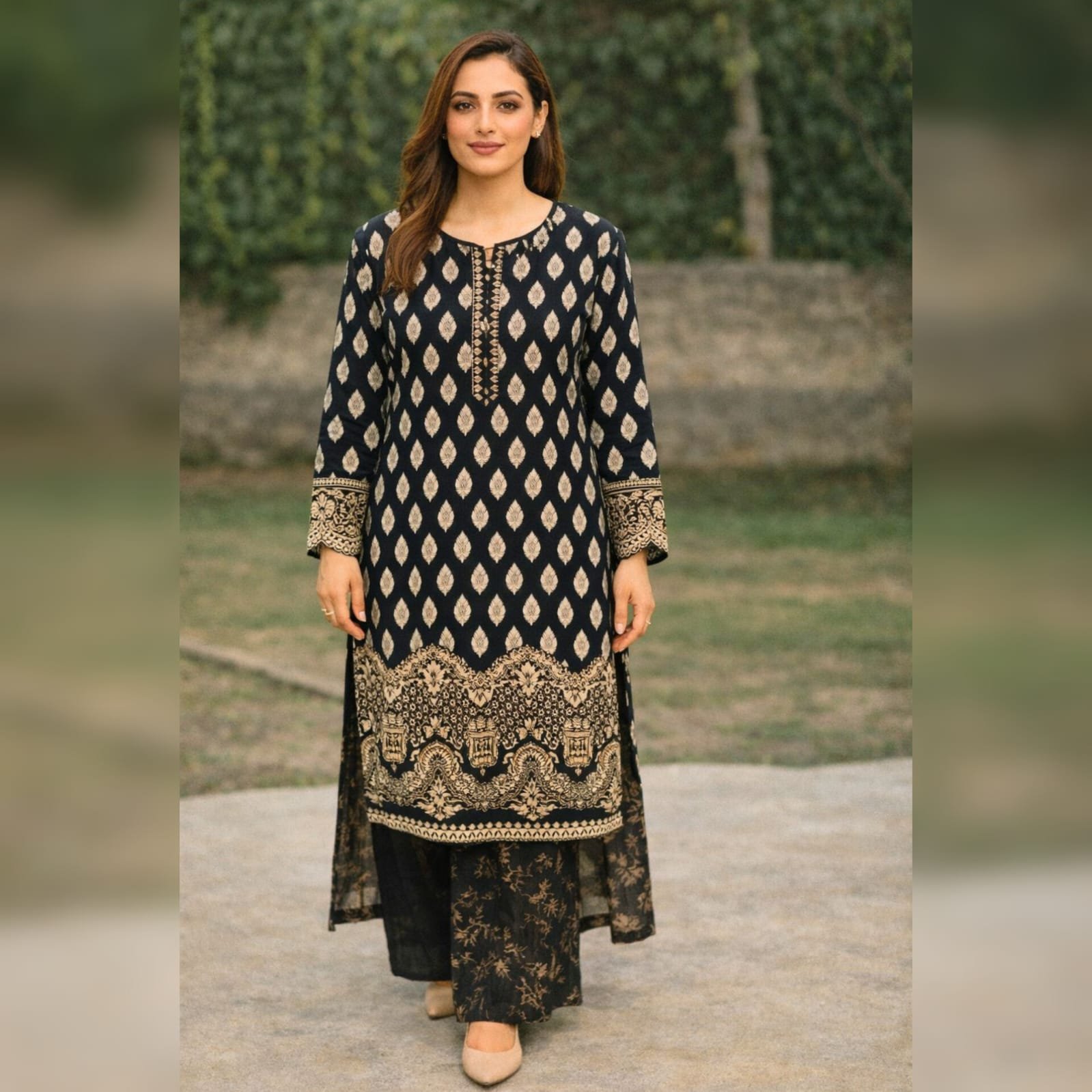This premium 3-piece cotton suit combines modern style with traditional comfort, featuring fine computer embroidery that gives it a clean, polished, and sophisticated appearance.
