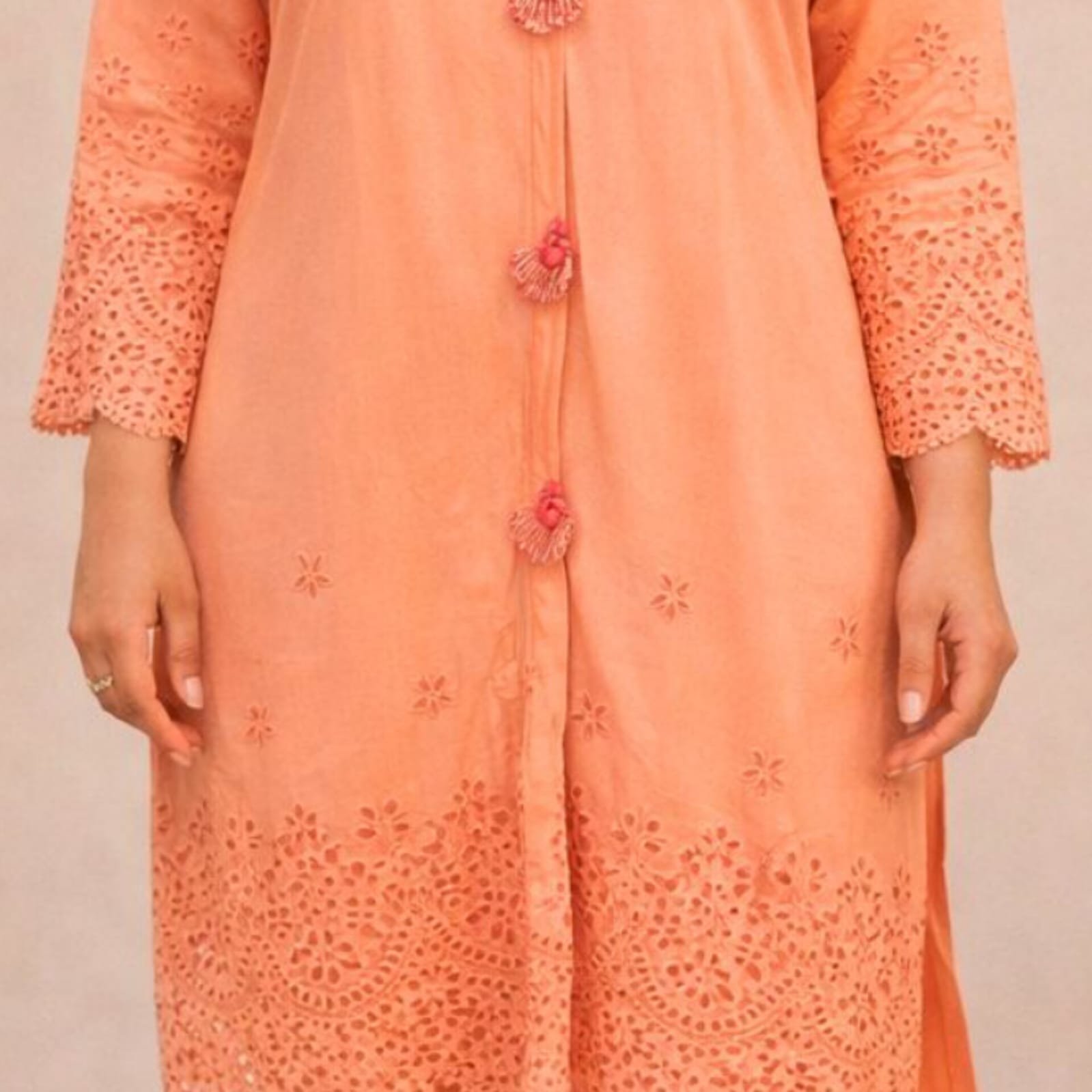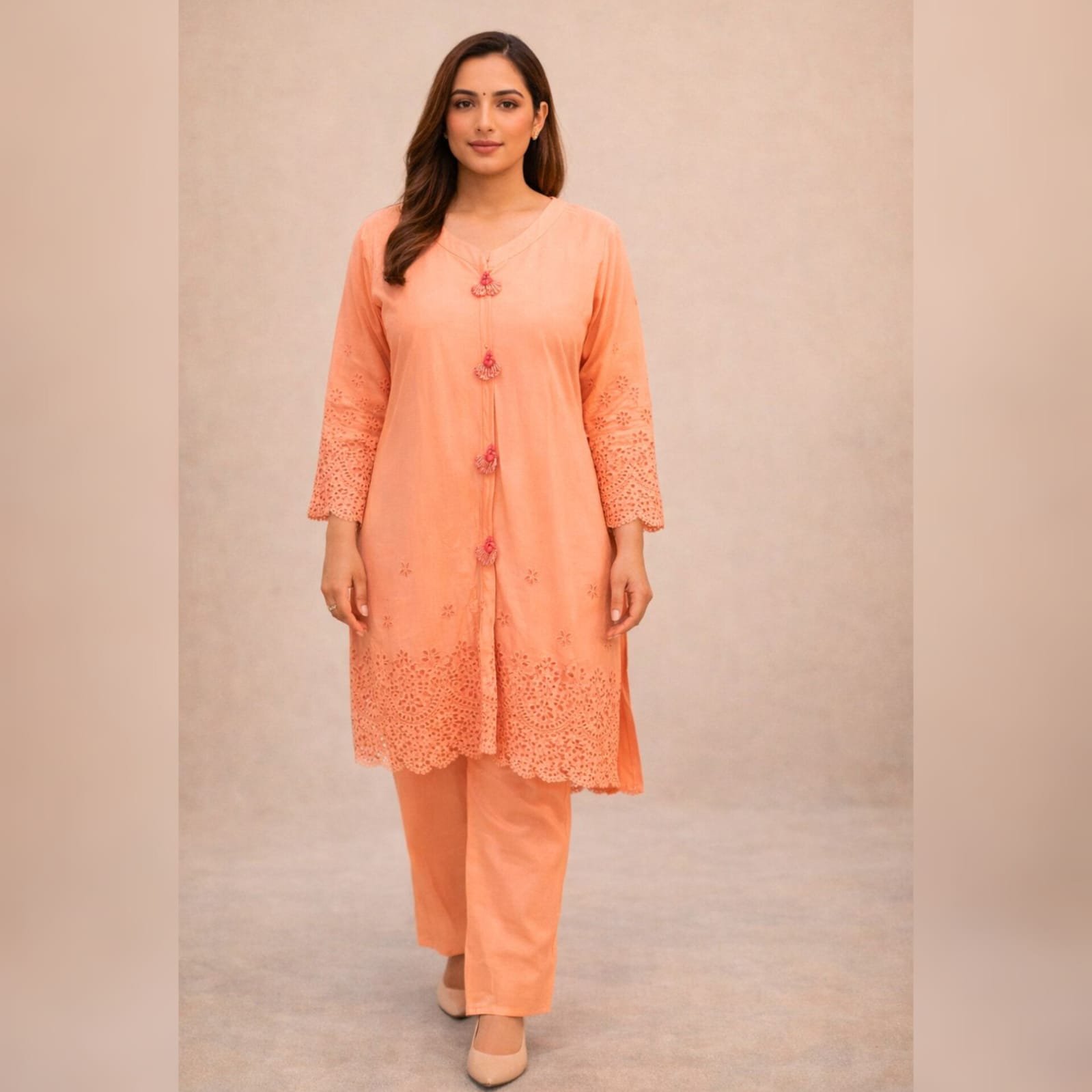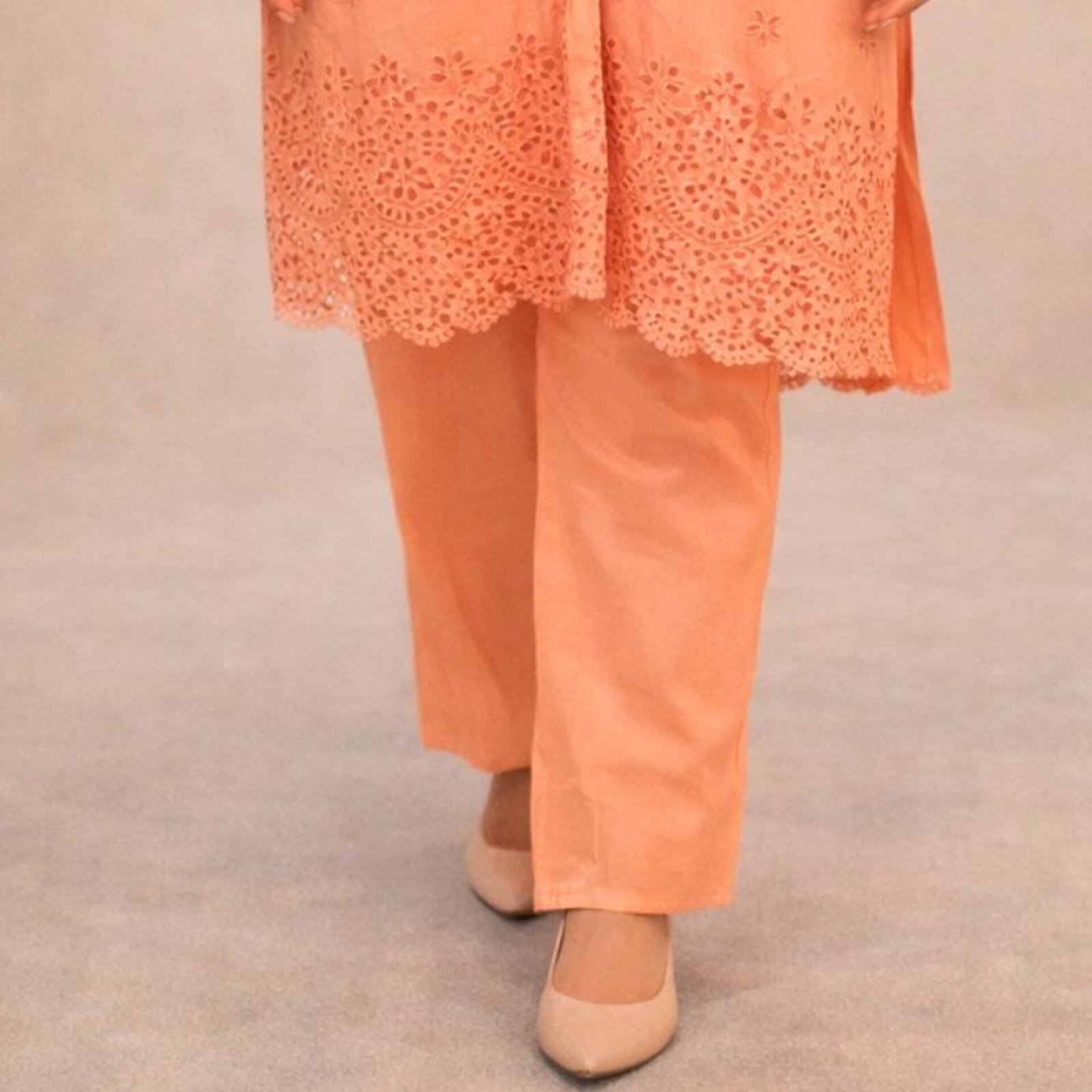 If you’re looking for a breathable, elegant, and timeless outfit that combines traditional embroidery with modern comfort, this 3-piece chicken kari cotton suit in Peach is an excellent choice for your casual wardrobe.