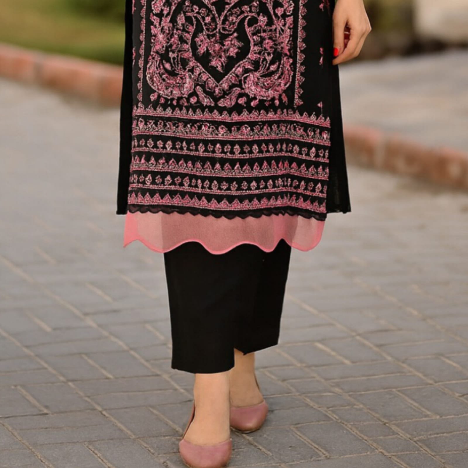 A comfortable 3PCs cotton suit with beautiful embroidery, made from soft and breathable cotton fabric. Perfect for casual events, family gatherings, or daily wear, this suit is available in classic black for easy styling. Lightweight and easy to maintain, it comes with a matching dupatta and trouser for a complete and practical outfit.